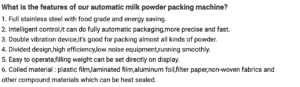 Application: This machine is suitable for packaging various powder products in food, chemical, pharmaceutical, condiment and daily necessities industries, such as soy milk powder, rice flour, milk powder, coffee powder and other powder materials.